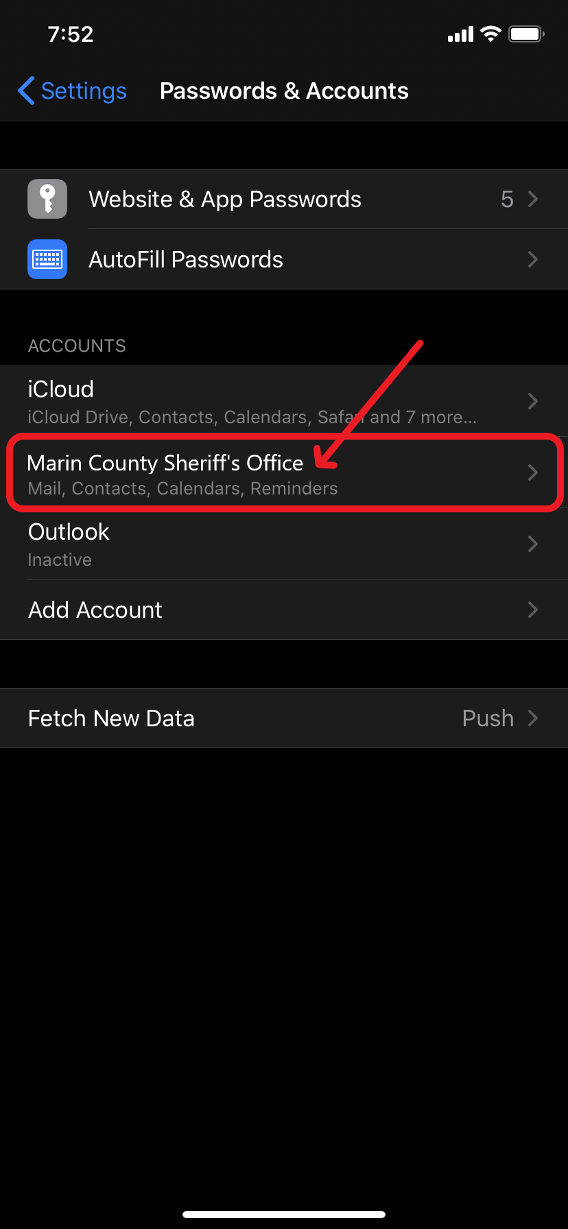 Tap: Settings > Passwords & Accounts > Marin County Sheriff’s Office
