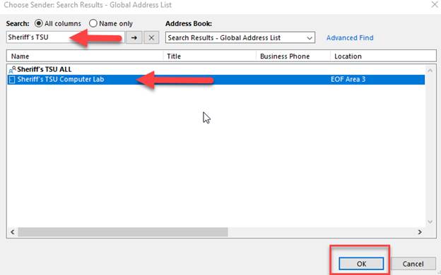 5.) In the Search Field type the name of the shared mailbox > in the search results click on the shared mailbox > Click OK